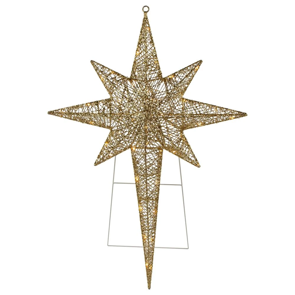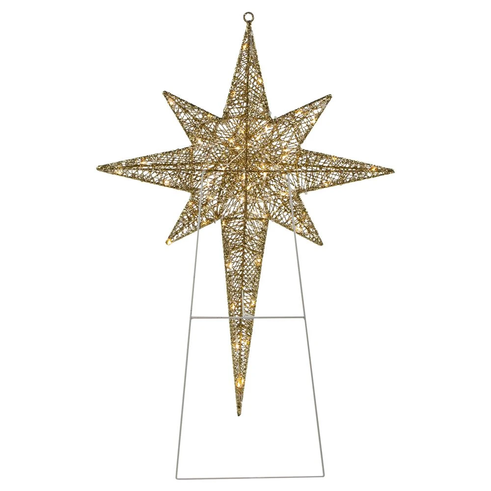 This hanging star is sure to light up your holiday decor! This star has the look of spun glass covered in sparkling gold glitter. The warm white LED lights provide a soft glow to your space. The loop at the top allows you to hang this star easily or you can use the easel-style stand to place in your yard.
