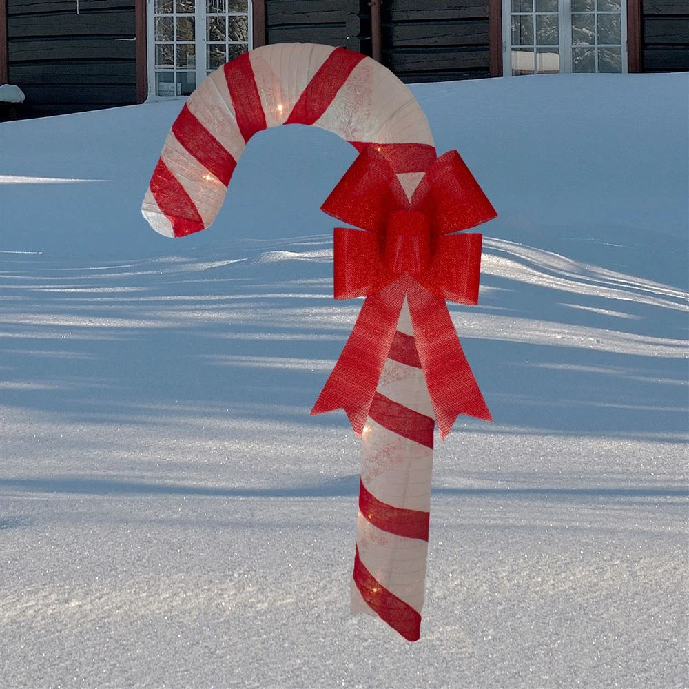 This oversized candy cane decoration is a stunningly festive addition to any commercial or residential Christmas display. It features a glittery snowflake design metallic red stripes and bow. This show-stopping piece is sure to catch attention wherever it is placed! Perfect for shopping malls hotels office buildings Christmas wonderlands or anywhere that commands attention. Product Features: warm white bulbs / white wire. Number of bulbs on string: 10. Bulb size: C7. Spacing between each bulb: 10.5-in. 55-in lead cord (spacing from the plug to the candy cane). Additional product features: 3-dimensional decoration. Some quick and easy assembly required. Collapsible construction for easy storage. Includes lawn stakes and clear zip cords. Comes with replacement fuse. UL certified and approved for indoor or outdoor use. 120 volts 60 hertz.6 amps 70 watts.